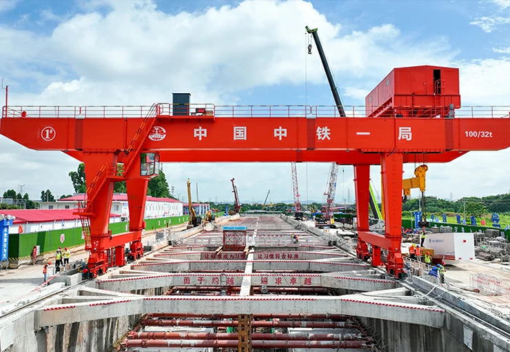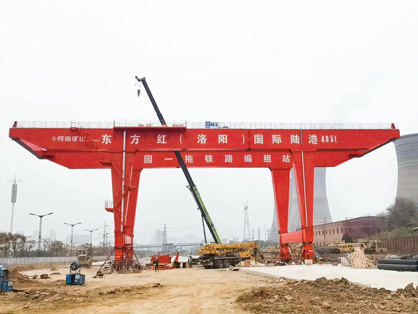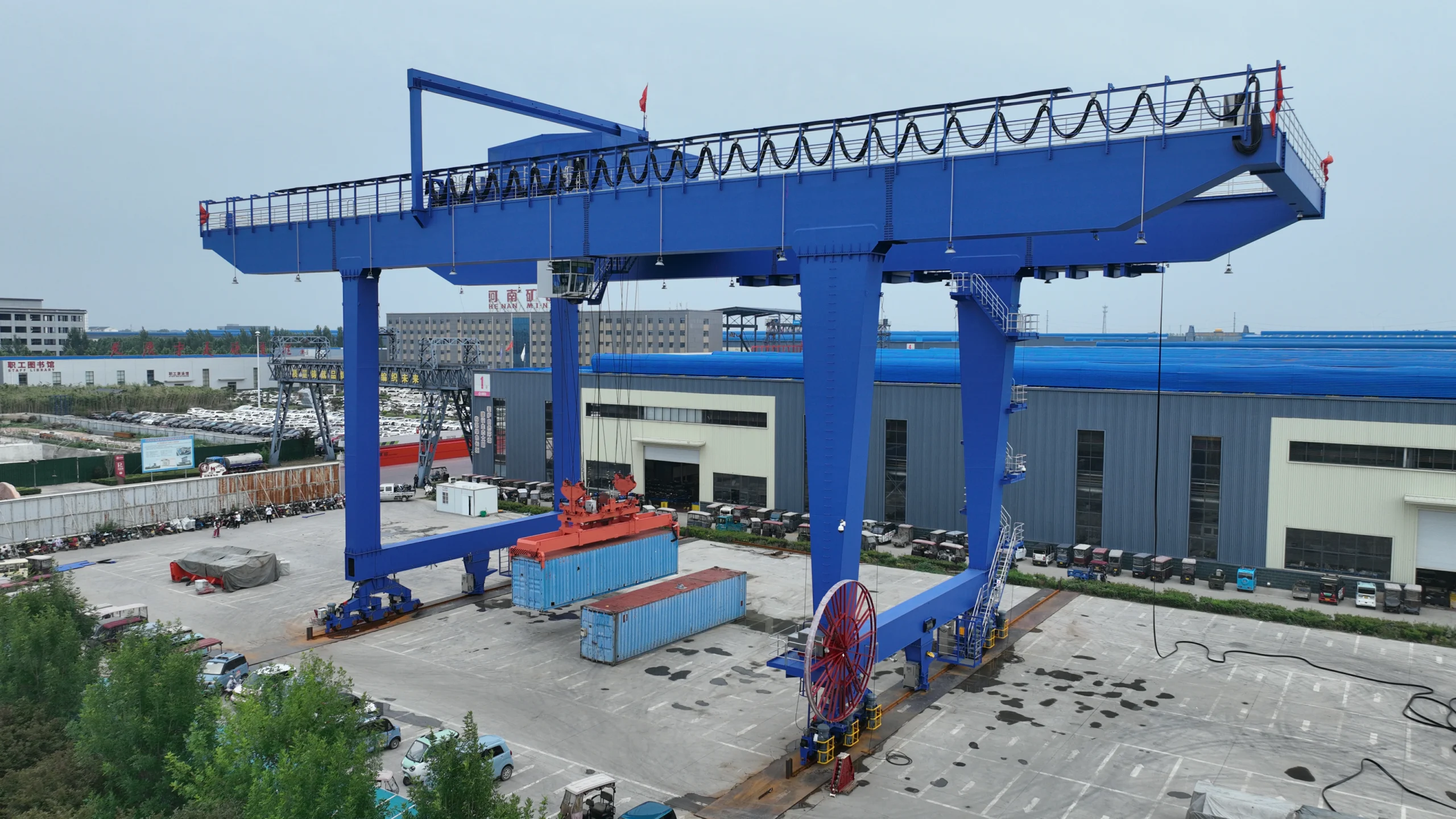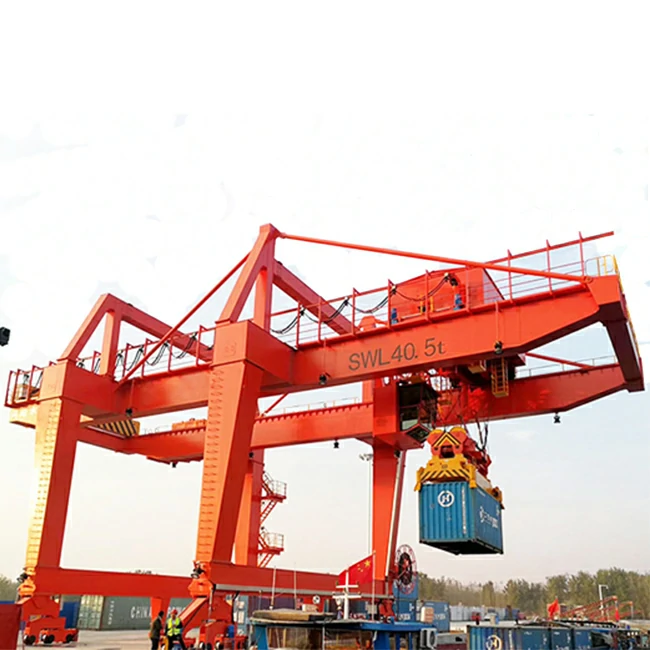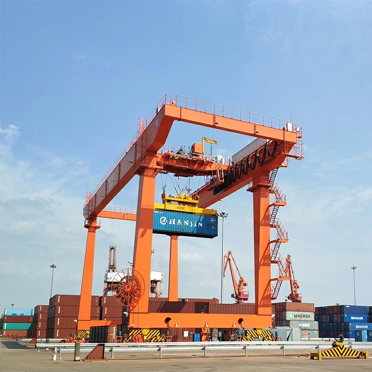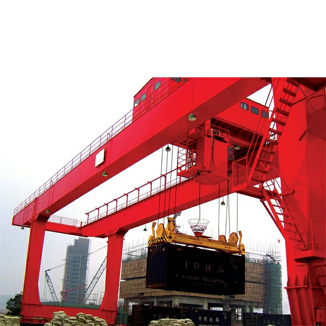 Rail mounted container gantry cranes also called RMG cranes are a type of heavy crane, travelling on fixed track, which is typically used to load and unload heavy items on rail transport yard, big container storage, docks, container yards and rail freight stations, transport and handling international ISO standard containers. The lifting capacity of rail mounted container gantry crane is 26 – 65 tons and the working class is A6.