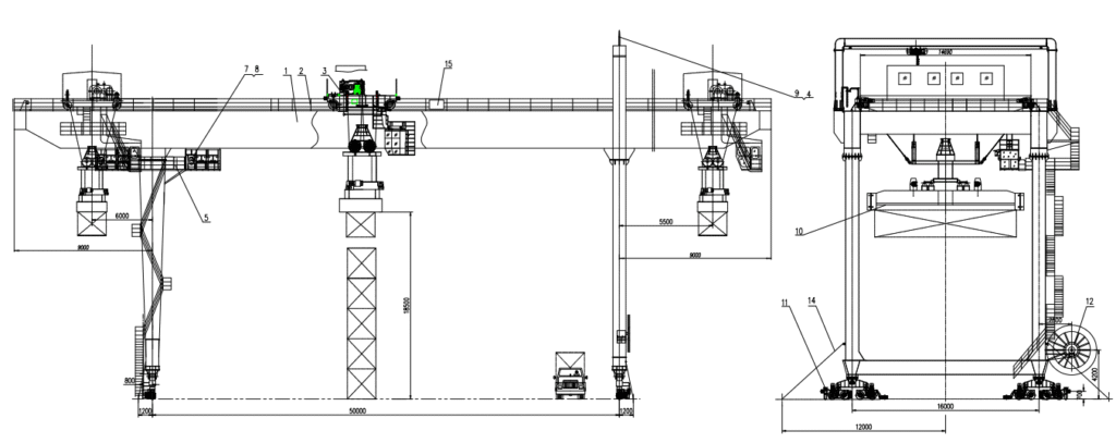 Rail mounted container gantry crane (RMG) generally includes the following units, steel frame, hoisting mechanism, minimum slewing mechanism, spreader anti-shaking mechanism, crane travel mechanism, trolley traverse mechanism, container spreader, electrical equipment and other accessory equipment for safety, Inverter, PLC and CMMS, etc.